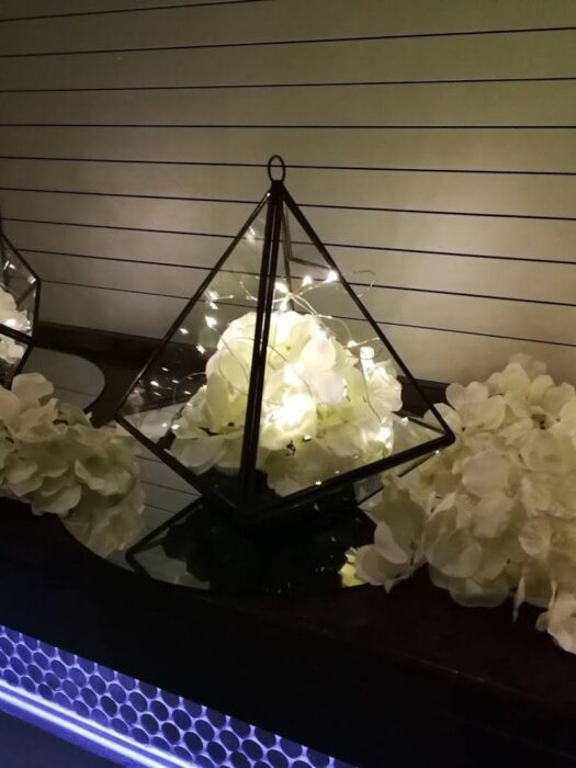 A black-framed triangular geometric terrarium—modern lines that suit succulents, air plants, and styled décor builds.